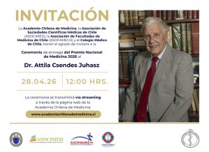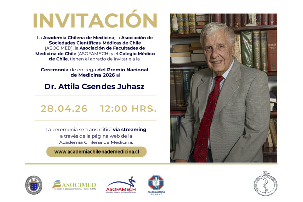 La ceremonia de entrega del Premio Nacional de Medicina 2026 al Dr. A. Csendes se efectuará en el Salón de Honor del Instituto de Chile el 28 de Abril a las 12:00 horas y será transmitida vía streaming a través de www.academiachilenademedicina.cl