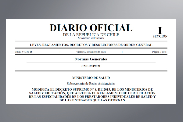 El Ministerio de Salud ha iniciado la tramitación del decreto de renovación de las especialidades a que se refiere el Reglamento de Certificación (D8). Con el fin de precaver que, mientras se da total tramitación a ese decreto, resulte excedido el plazo de las certificaciones de especialidad, se ha dispuesto extender la vigencia de dichas certificaciones hasta el último día del sexto mes siguiente a la publicación del Decreto de Renovación en el Diario Oficial.